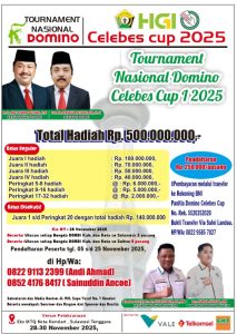 Turnamen nasional Celebes Cup 2025 yang akan digelar pada 28–30 November di Kendari tercatat sebagai salah satu kompetisi domino terbesar di Sulawesi. Total hadiah yang disiapkan panitia mencapai Rp500 juta, termasuk hadiah utama Rp100 juta untuk juara reguler.